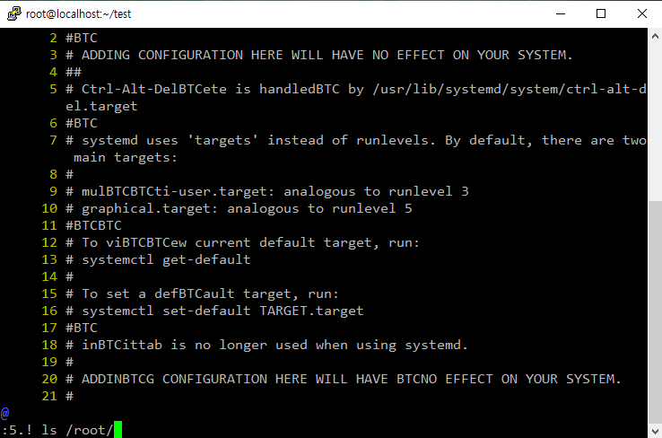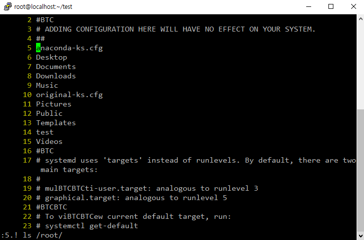 +) : 기호 오른쪽 에 숫자를 입력해 그 줄을 기준으로 동작 가능 ex) :5.! ls /root/
