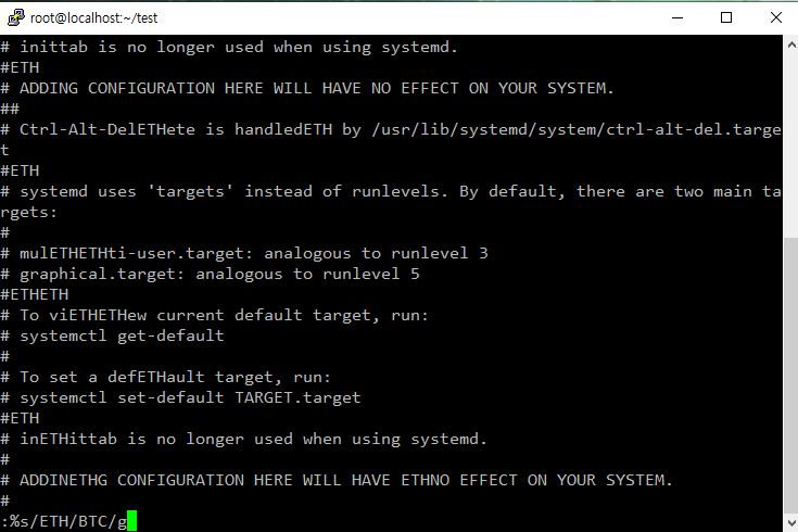 전체의 범위에 ETH를 BTC로 동일한 문장에 여러개 있으면 전부다 바꾼다.